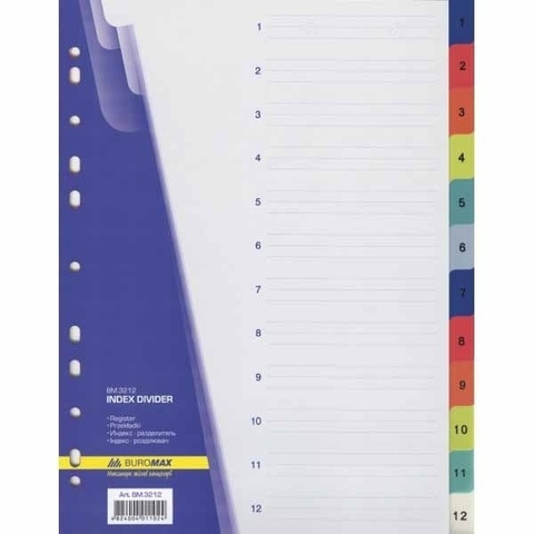 Разделитель страниц А4 пластиковый 1-12, цветной. С помощью разделителей разных цветов удобно классифицировать большой объем документации в блочных тетрадях, архивных папках формата A4. Изготовлены из гибкого непрозрачного пластика с мультиперфорацией и вырубкой. Также имеется бумажный вкладыш с очерченными графами для заполнения.
